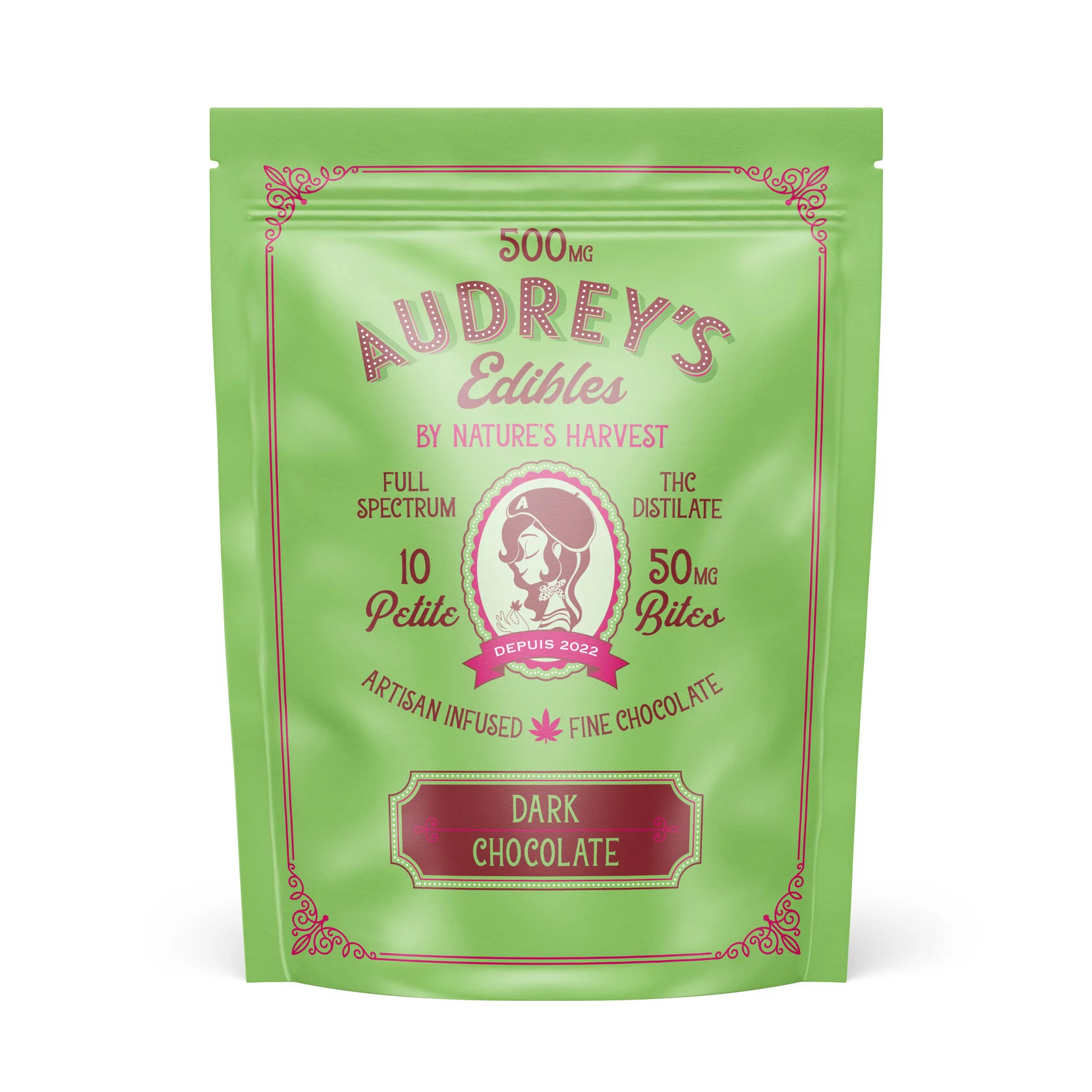 Indulge in these full spectrum fast acting 10 chocolate bites per pack 500mg total per pack (50mg x 10) chocolate bites by Audrey’s Edibles.